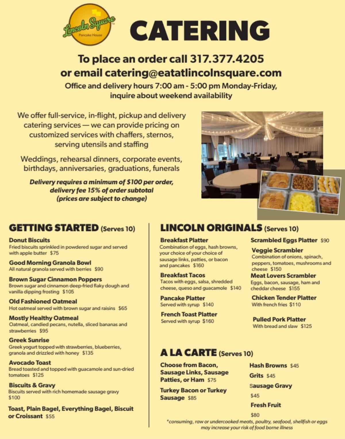 Catering service is available from Lincoln Square Pancake House. We can cater to your next event, whether it's a business meeting or a family reunion we can provide you with delicious food. Please call us at 317-377-4205 or fill out the contact form on the Contact Page.
